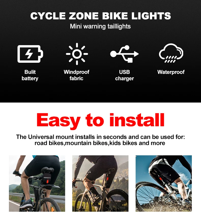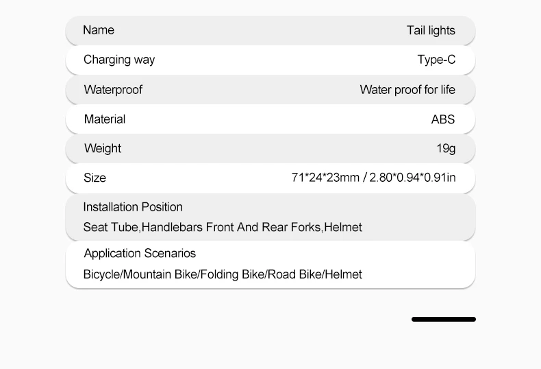 • USB Rechargeable :The rear light can be easily recharged using a USB cable, eliminating the need for batteries.