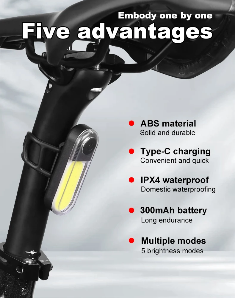• Cob LED :The rear light uses COB LED technology, providing a brighter and more uniform light than traditional LEDs.